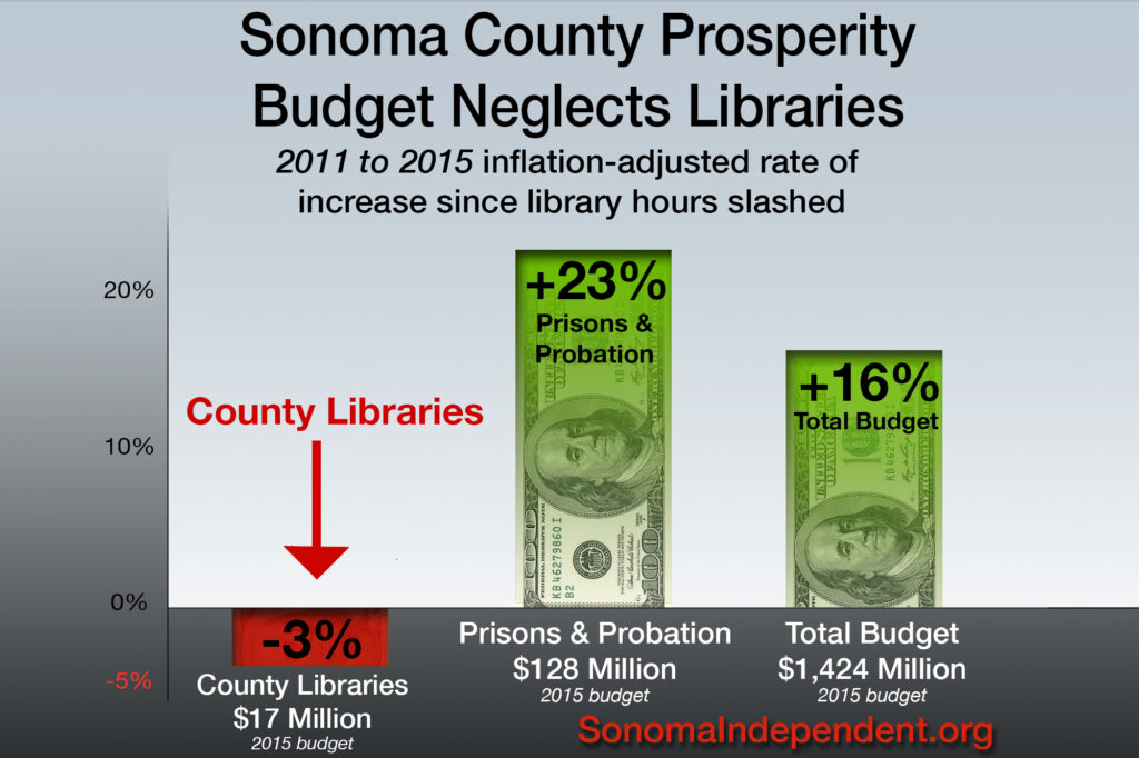 As Sonoma Independent’s chart below shows, during the four years since the Monday closures in 2011, the total Sonoma County budget, when adjusted for inflation of 5%, has increased by 16%. During this same period, inflation adjusted library spending decreased by 3%, to $17 million. Meanwhile, despite declining crime rates, inflation-adjusted spending on prisons and probation during the same period (boosted by state prison “realignment” funds) has increased by 23%– more than $26 million annually, to $128 million.