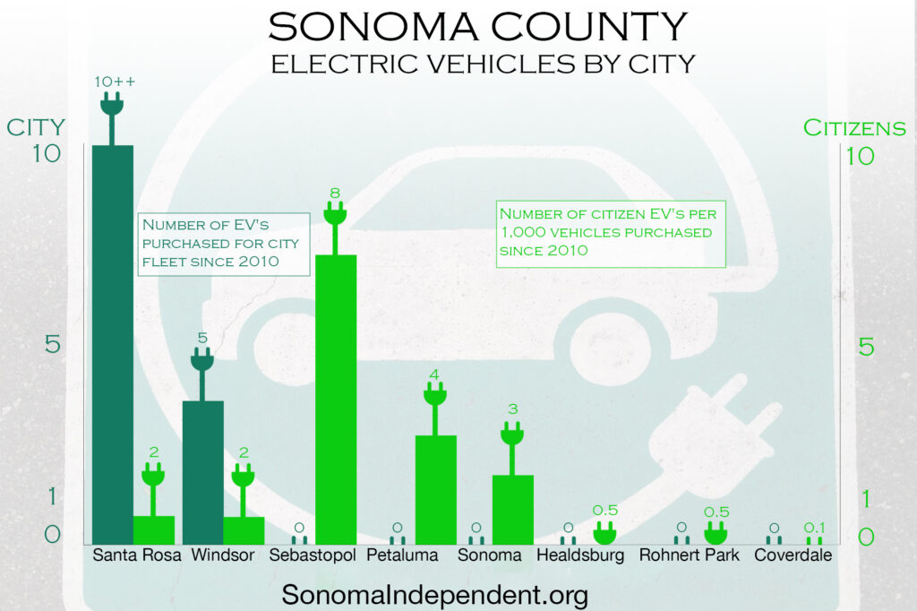 What we learned is that at a time in which nearly every candidate for local city council expresses a commitment to helping reduce carbon emissions, only three cities in Sonoma County—Santa Rosa, Windsor, and Healdsburg– have been adding electric vehicles to their fleets.