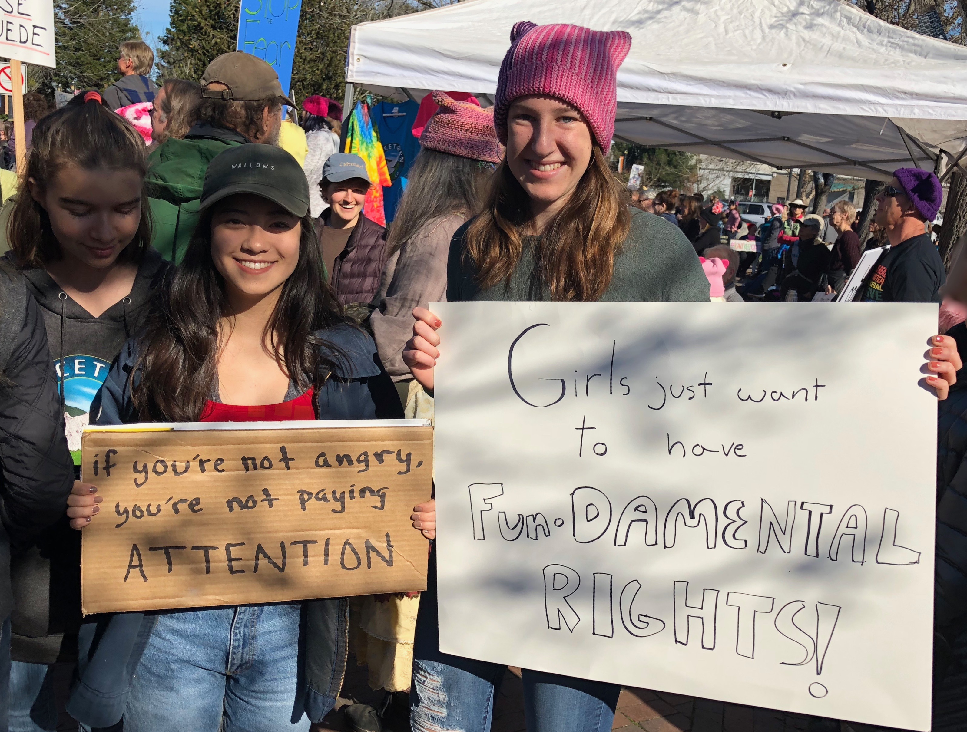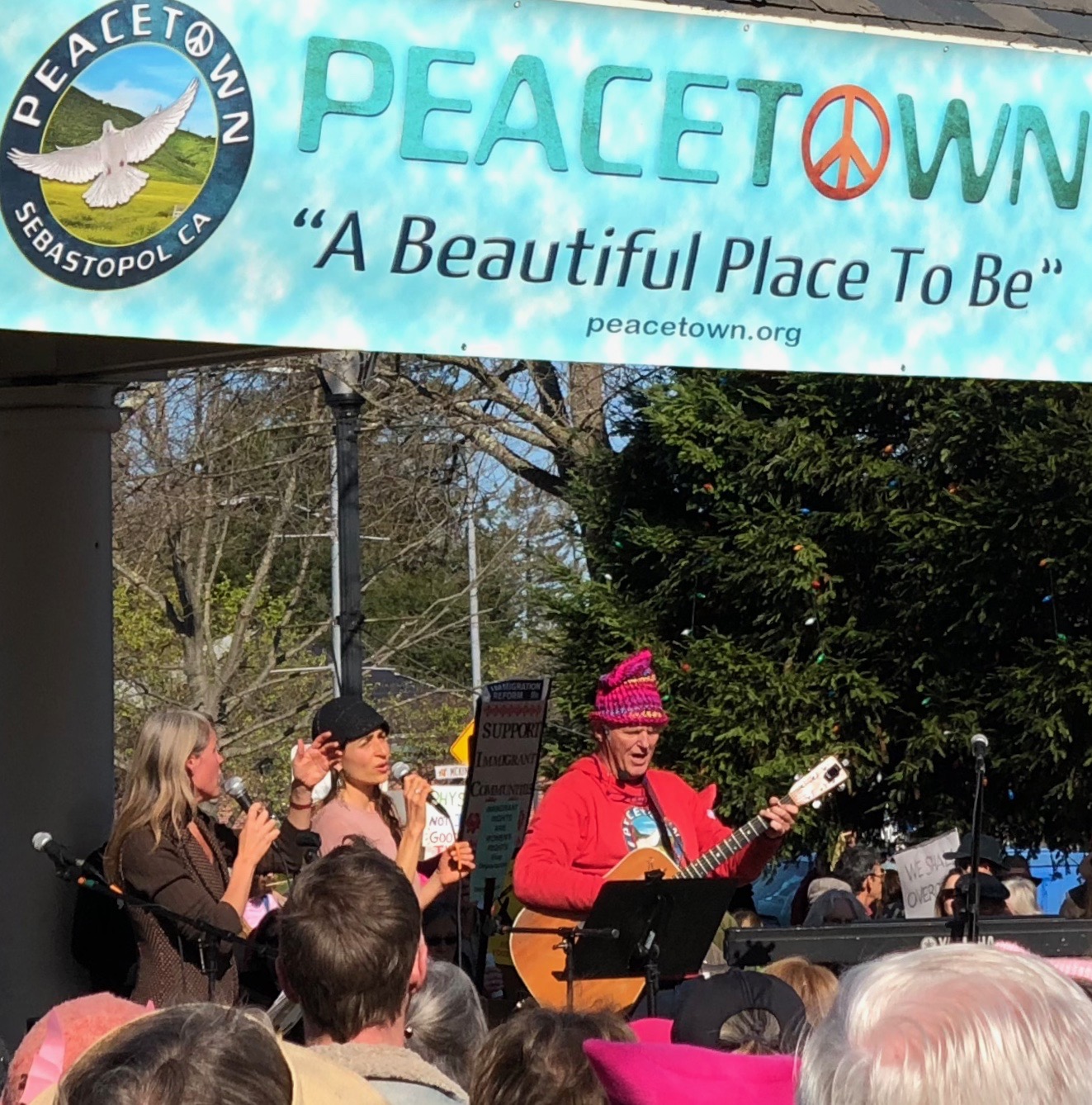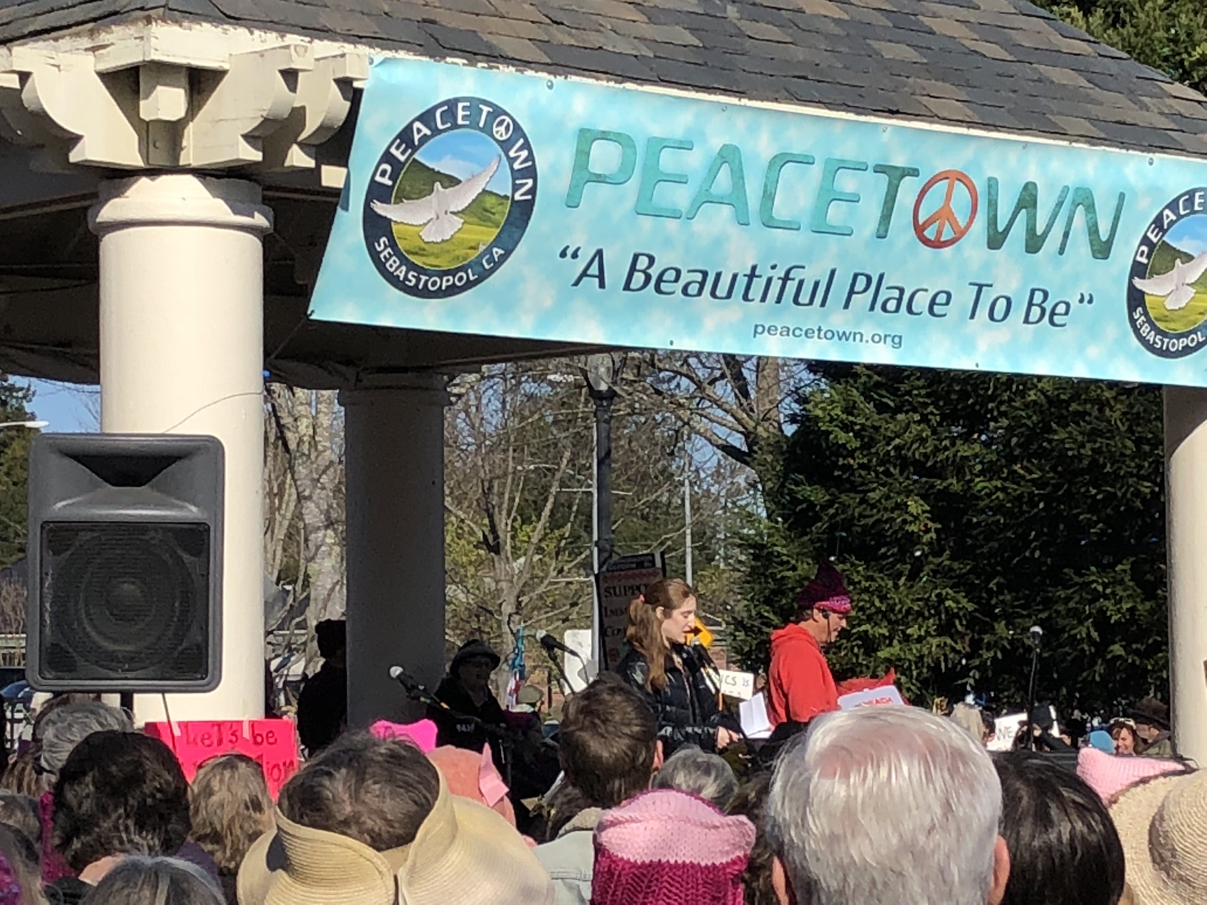 At noon on January 21, 2018, as hundreds of other women’s marches and rallies occurred across the United States to protest the one year inauguration of President Trump, a crowd estimated by the Sonoma Independent to number more than 1,000 women and men of all ages turned out in Sebastopol’s Town Square. The event, which drew the largest number of people ever to fill the public commons of “Peacetown, USA,” featured the legendary California singing duo known as MaMuse. Sebastopol City Council member and recent mayor Una Glass spoke of the common struggle for womens’ rights, justice and immigrant rights and 17-year old Mikaiya Gude later spoke on behalf of the many young activists in the crowd. Mikaiya’s short talk is reprinted in its entirety below. -Editor