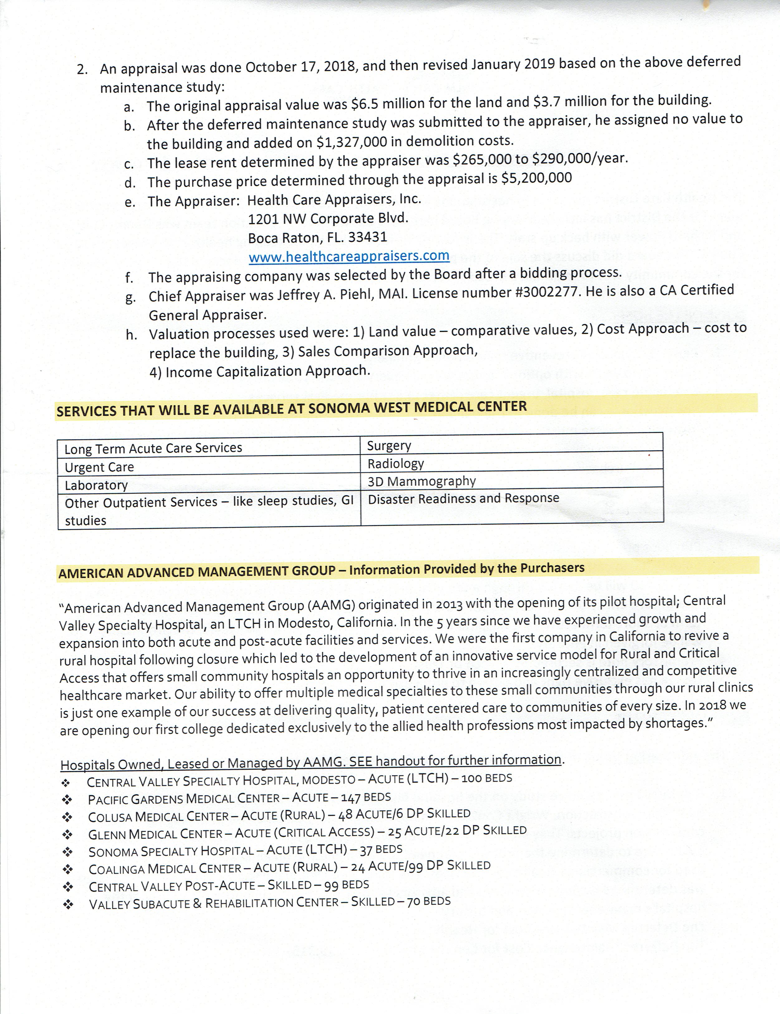 At a February 4 meeting of the District Board, Power voted 4 to 1 with the majority of the Board to approve the sale of the hospital for what a final definitive appraisal found to be the legal “fair market value” of  $5.2 million. The two-page final term sheet for American Advanced Management Group  (AAMG), a health services company with a proven track record specializing in turning around the fate of besieged small community hospitals like Palm Drive,  can be read below and here: Term Sheet of Hospital Sale to AAMG Feb 4 2019