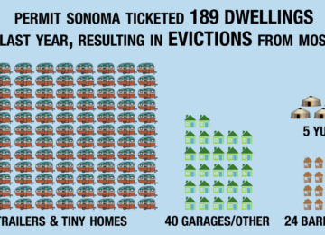 A month long review of thousands of citations by Permit Sonoma showed that in the midst of the largest housing crisis in history, the county’s code enforcement agency was evicting nearly 200 tenants, many of them seniors, from safe, affordable tiny homes and trailers. This was double the number of unhoused people that Sonoma County acquires emergency housing for; at a cost, to taxpayers, of $20 million each year.